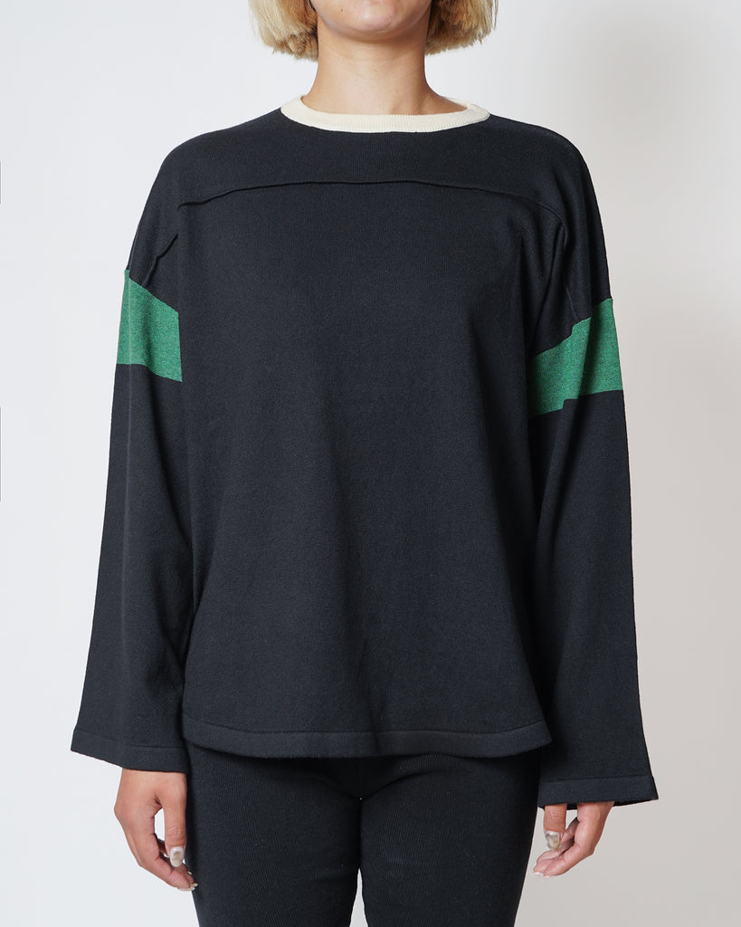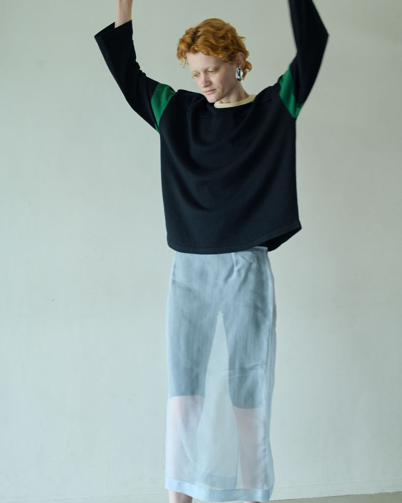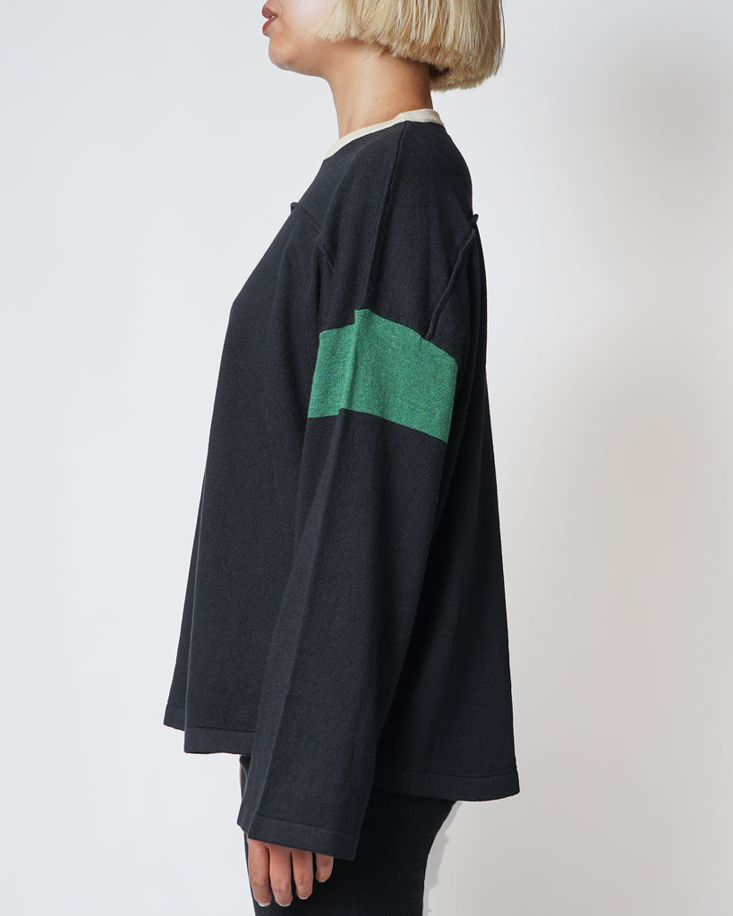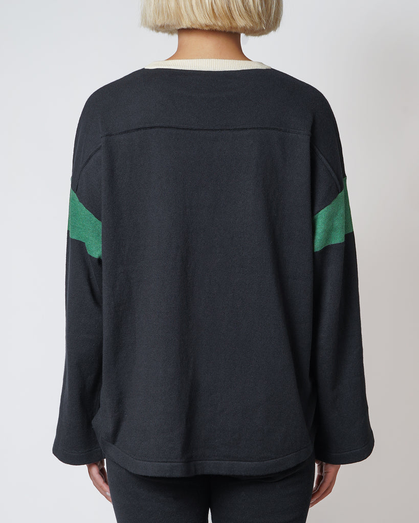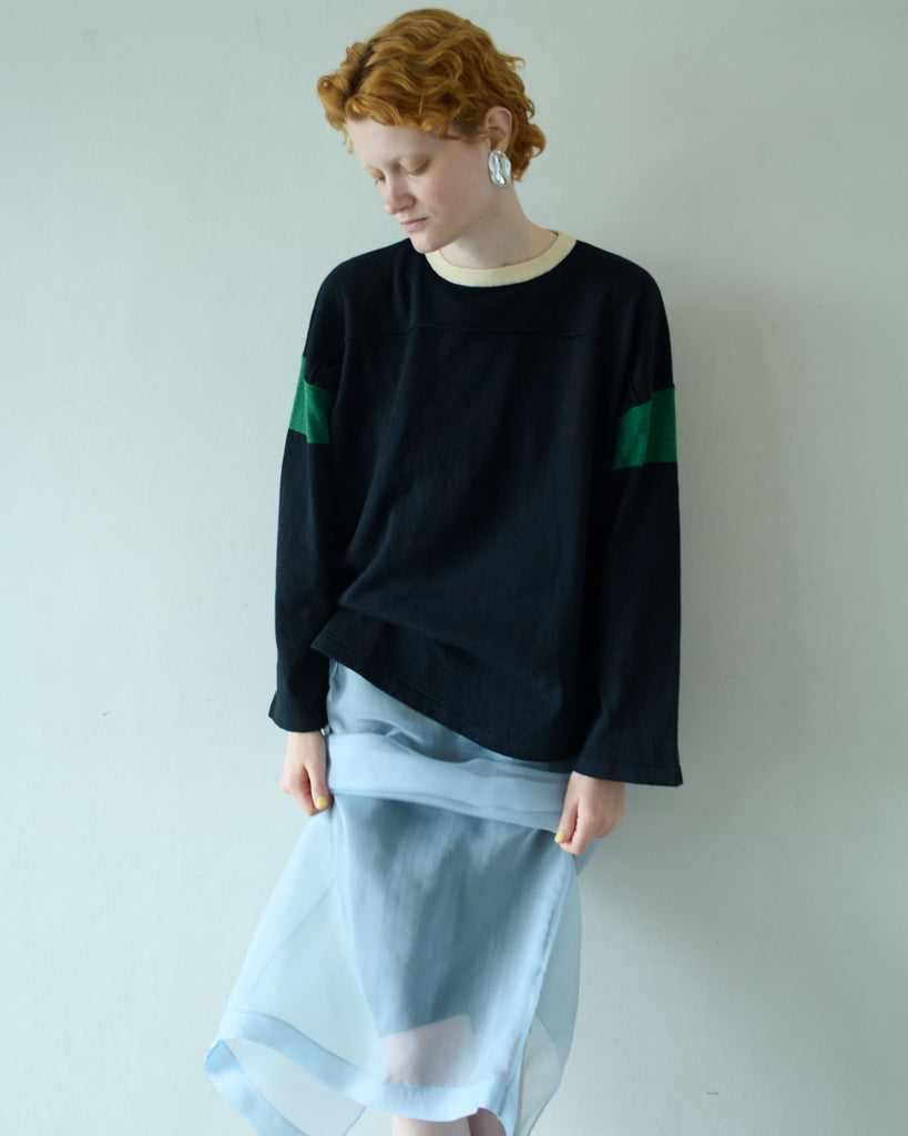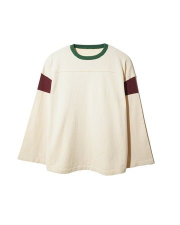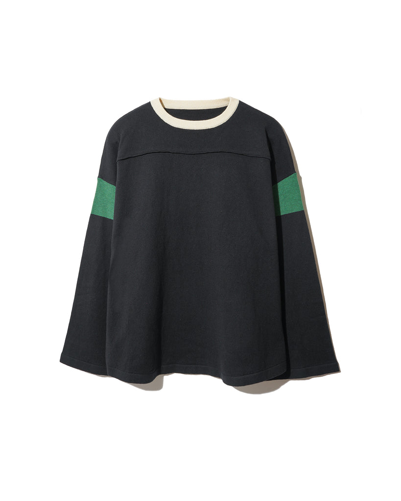 大人のスタイリングに取り入れやすいスポーツアイテムをフットボールシャツをベースにコットンカシミヤの上質な素材で再現しました。袖部分に切り替えのアクセントを入れシンプルながらも存在感があるように仕上げています。
